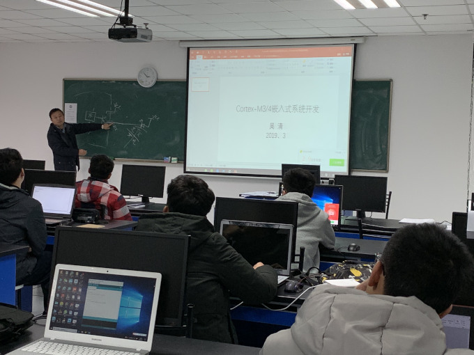 本次活动分为二个部分。第一部分安全教育。吴清老师用风趣幽默的语言给学生们普及实验室安全知识,使学生认识到安全事故的危害性,懂得如何保护自我和实验室财物。第二部分Cortex-M3/4嵌入式系统开发的培训,以实验中心Cortex-m3实验模块为基础,掌握如何开发嵌入式系统,为参加各类全国大学生比赛打下基础。