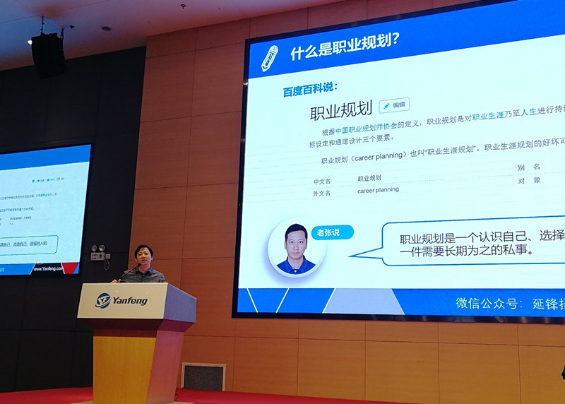 随后,张佳伟介绍了延锋公司的发展历程、业务板块、技术创新和人才培养体系等方面内容,并为同学们带来了一场精彩的职业规划讲座。他希望大家从认清自我开始,注重自身综合素质和专业能力的培养,选择适合自己的行业和企业,做好生涯规划,为“从书包到公文包”的转变做好准备。