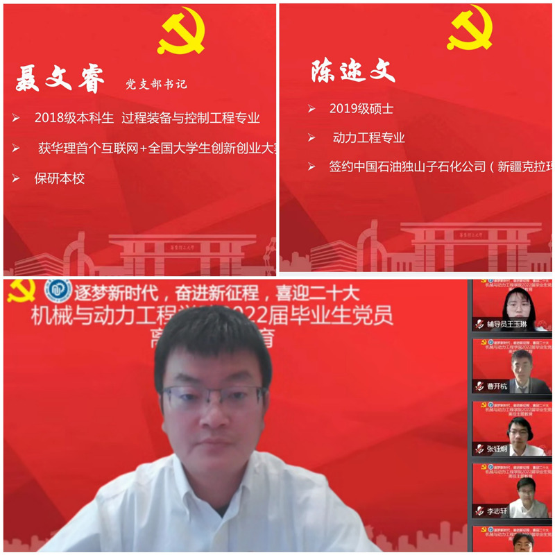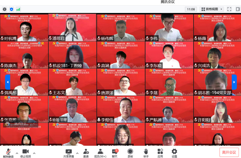 为进一步激发毕业生党员爱党爱国爱校情怀,增强党员使命担当,5月23日,机动学院举办主题为“逐梦新时代,奋进新征程,喜迎二十大”的毕业生党员离校线上教育活动。学院党委书记杨强,副院长陈建钧,机械工程系副主任李锦以及139名毕业生党员等参加活动。活动由党委副书记李煜佳主持。
