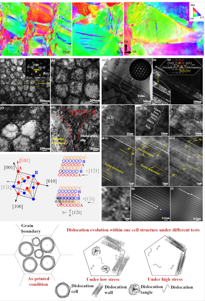 近日,开云官方网页版官网的硕士研究生陈亦楠围绕L-PBF增材制造面心立方晶体(FCC)结构的CoCrFeNi高熵合金在交变载荷工况下的疲劳行为及损伤演变机制持续深入研究;发现激光快速非平衡熔凝的CoCrFeNi微观结构含有高密度的小角度晶界、异常显著的晶内胞状亚结构和原子堆垛层错特征,促使在较低应力水平的交变应力下诱发大量纳米孪晶,建立和阐明了上述因素交互作用的物理机制模型;探明了在L-PBF增材制造CoCrFeNi疲劳行为中的位错胞(Dislocation cells)演变过程及其与晶内胞状亚结构(Cellular structures)的交互作用机理,位错受胞壁结构(Cellular walls)阻碍、在一定范围往复移动导致位错湮灭、解离和重排,位错重排则倾向于形成较低能量构型,即具有交替高-低密度位错区域的新型位错胞壁(Dislocation cell-walls),这不仅改善了高周疲劳性能,同时能阻碍位错的大范围移动,为反应生成纳米孪晶提供了更大可能;此外,通过施密特因子计算及相同尺寸、不同取向的晶粒内部诱发孪晶比例量化对照,意外发现L-PBF增材制造FCC系列HEAs纳米孪晶更易在<110>取向的晶粒内部产生,这可为通过L-PBF激光工艺改变微观晶粒取向分布、实现构-性精准调控和强韧取向性的人工设计,提供新的可行路径。
