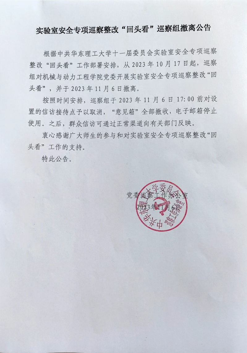 实验室安全专项巡查整改“回头看”巡查组撤离公告