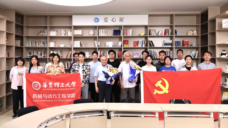 课后,同学们纷纷与两位老先生合影留念,并为其献上鲜花和最新版华理校门模型,表达对两位老先生的尊敬和祝福。