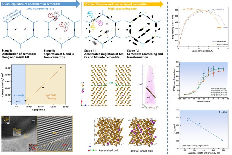 材料中第二相颗粒的演化一直是材料科学家的研究焦点,人们普遍认为碳化物粗化服从原子扩散主导的均匀粗化机制,提出了球形颗粒、各向同性扩散等科学假设,却与工程材料实际服役状态存在偏差。例如,在核反应堆压力容器用16MND5低合金钢中,碳化物作为关键强化相之一,其在长时服役过程中发生的粗化行为势必引起材料性能劣化,揭示碳化物的粗化机制已经成为制定在役核电装备延寿策略和开发下一代核电材料的关键问题。